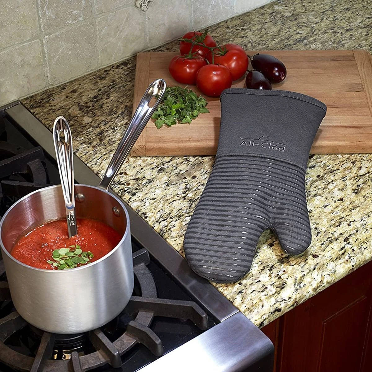 When it comes to choosing an oven mitt the most important thing is protecting yourself from burns and no oven mitt does it better than the Pewter Silicone Oven Mitt from All-Clad. Made from 100% cotton twill and coated in silicone on both sides, this oven mitt has superior heat resistance and additional protection around the thumb to prevent burns. This construction also extends the life of the oven mitt, allowing for it to withstand high oven temperatures and resist stains for much longer than regular oven mitts. Designed to protect more than your hands, this oven mitt is 14″ long and features a no-slip grip to avoid spills. Don’t risk your family’s hands with any other oven mitt, get the All-Clad Pewter Silicone Oven Mitt today and get superior protection from burns for years to come.