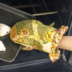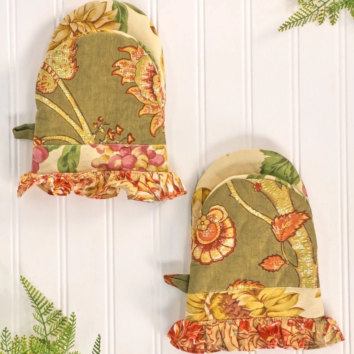 Perfectly prepare your kitchen for fall down to the last detail with the April Cornell Mini Mitts (Set of 2) in Pumpkin Hollow Patchwork! Made of 100% cotton and machine wash safe, these oven mitts are a practical and stylish addition to your home during the autumn season. Decorated in April Cornell’s Pumpkin Hollow Patchwork prints, these mitts feature a patchwork design that showcases autumn florals in deep shades of ochre, olive, and rust that coordinates beautifully with other pieces from April’s Pumpkin Hollow Patchwork Collection – letting your kitchen decor easily change as the leaves do.