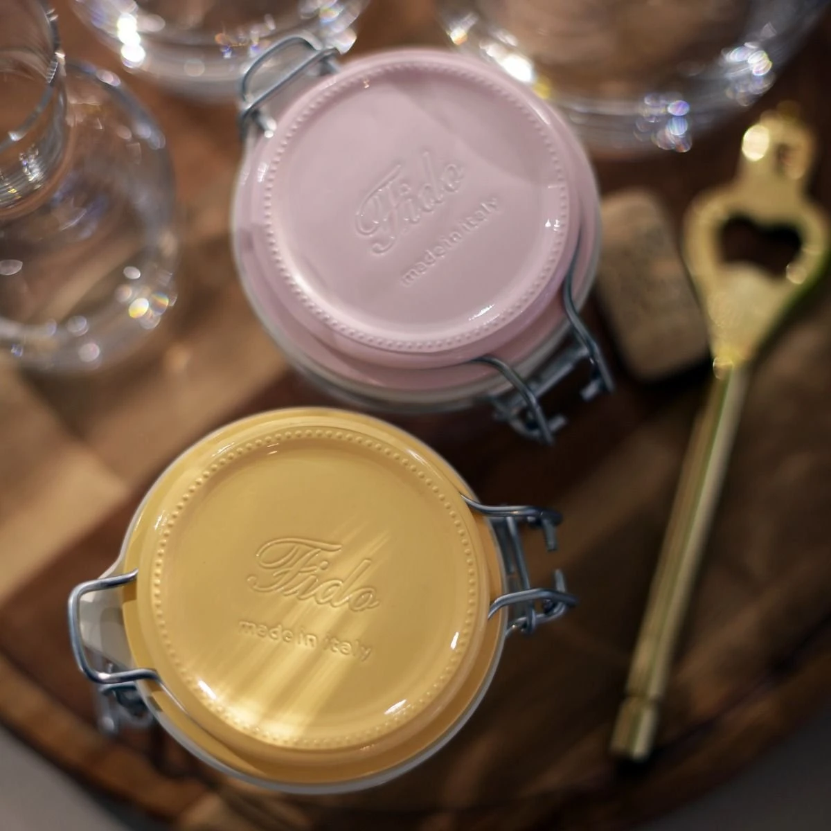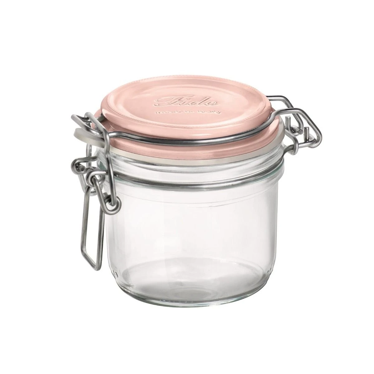 Store foods, pack a lunch, or curl up with a snack using the Bormioli Rocco 6.75oz Swing Top Fido Jar! This glass jar is crafted from eco-friendly lacquered glass and features a hermetic seal to prevent leaks and keep food fresh. Ideal for storing coffee, sugar, salt, cereal, nuts, spices, and more! The 6.75 oz capacity is equal to just under a cup, making it the perfect size for a serving of your favorite snack. This jar can even be used to store jellies, jams, and preserves! The soft pink lid adds a unique and delicate elegance to it, making the Bormioli Rocco 6.75oz Swing Top Fido Jar an attractive storage option even outside of the kitchen.
