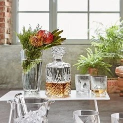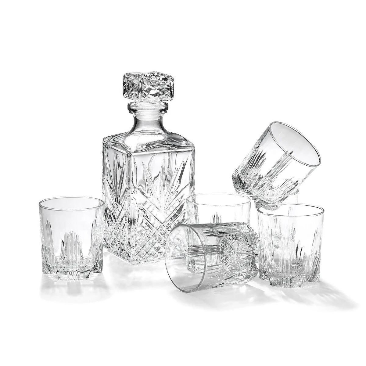 The Bormioli Rocco Whiskey Set includes everything you need to serve your fine whiskey in style. Made from cut glass this whiskey set includes a 33.75 oz whiskey decanter and six 9.5 oz whiskey glasses. While the whiskey set pieces are dishwasher safe, hand washing is recommended.