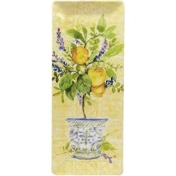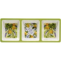 Enjoy bringing some zest to your tabletop with the Certified International 3-Piece Melamine Hostess Set in Lemon Zest! This set includes (1) 14.5″ Chip & Dip Platter, (1) 14.5″ x 5.75″ 3-Section Relish Tray, and (1) 19″ x 8″ Rectangular Platter. Made from durable melamine, this set is perfect for both indoor and outdoor dining, as the gorgeous print of lemons with leaves flourishes throughout each piece, inviting the joys of summertime to your dining experience. Get ready to entertain your guests and serve delicious dips with fresh fruit, veggies, and chips, and set out small appetizers on the rectangular platter for the ultimate summertime affair. As it is made from melamine, this set is not safe to use in the microwave, but it is utterly dishwasher-safe for easy cleaning. Great for baby showers, hosting, and housewarmings, the Certified International 3-Piece Melamine Hostess Set in Lemon Zest will bring the lemon groves to your events and make each dining experience special!