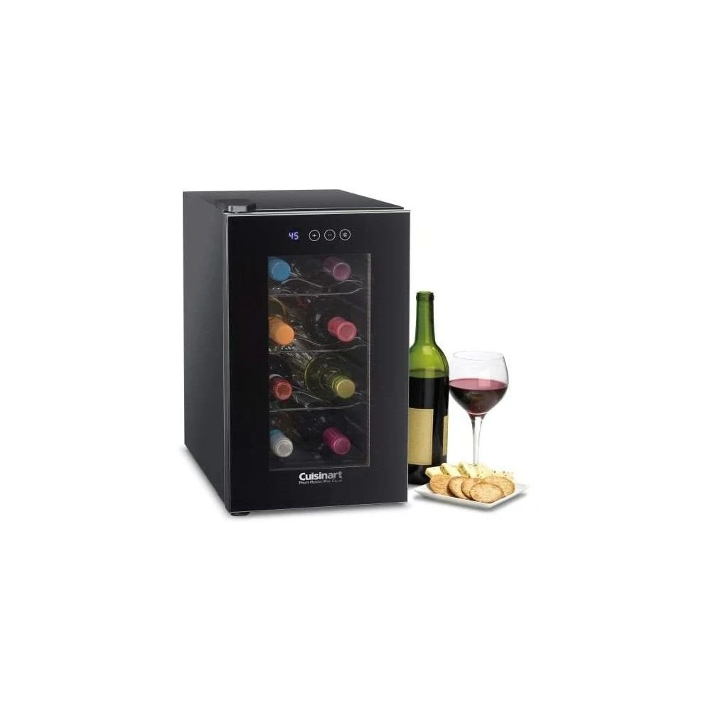 If you’re looking for a stylish and practical wine storage solution, the Cuisinart 8 Bottle Private Reserve Wine Cellar combines technological sophistication with ease and convenience. The touchscreen control moderates an efficient thermoelectric cooling system that quietly and efficiently maintains temperatures from 39°F to 68°F, providing optimal storage temperatures for reds, whites, or Champagnes. An LED displays the cellar’s current temperature, while a triple-pane viewing window let’s you quickly take stock of the contents with a glance. Soft interior lighting can be controlled using the touchscreen. Three contoured chrome racks cradle bottles and can be removed for cleaning or to reconfigure the cellar for storing fewer, but larger, bottles. The cellar features a black exterior finish that is easy to wipe clean and coordinates with other black appliances. Adjustable feet enable you to compensate for a variety of flooring materials while keeping the cellar level. Whether you’re holding a few specials bottles in reserve or keeping your house favorites on hand, the Cuisinart 8 Bottle Private Reserve Wine Cellar is a stylish and efficient solution!