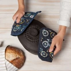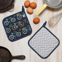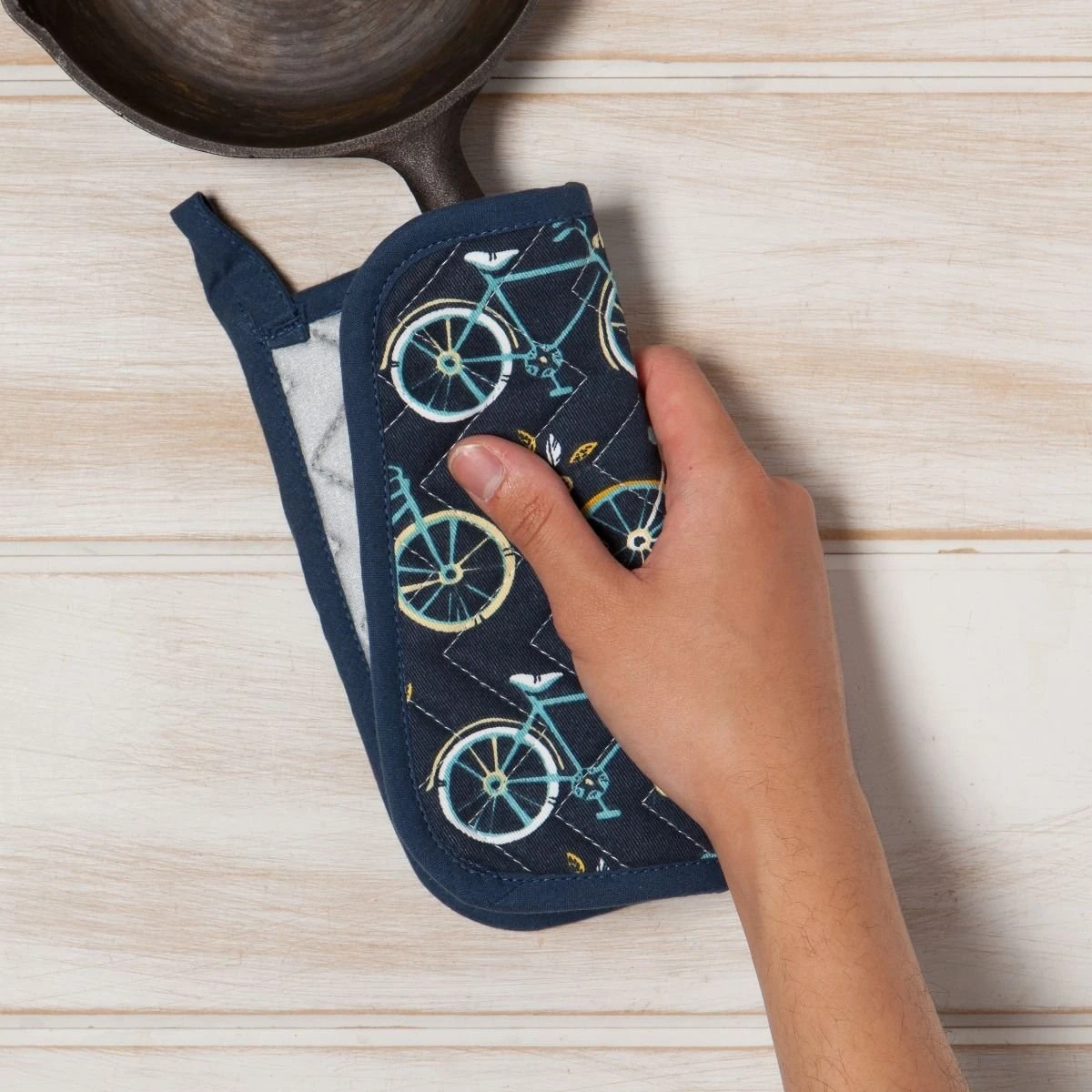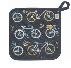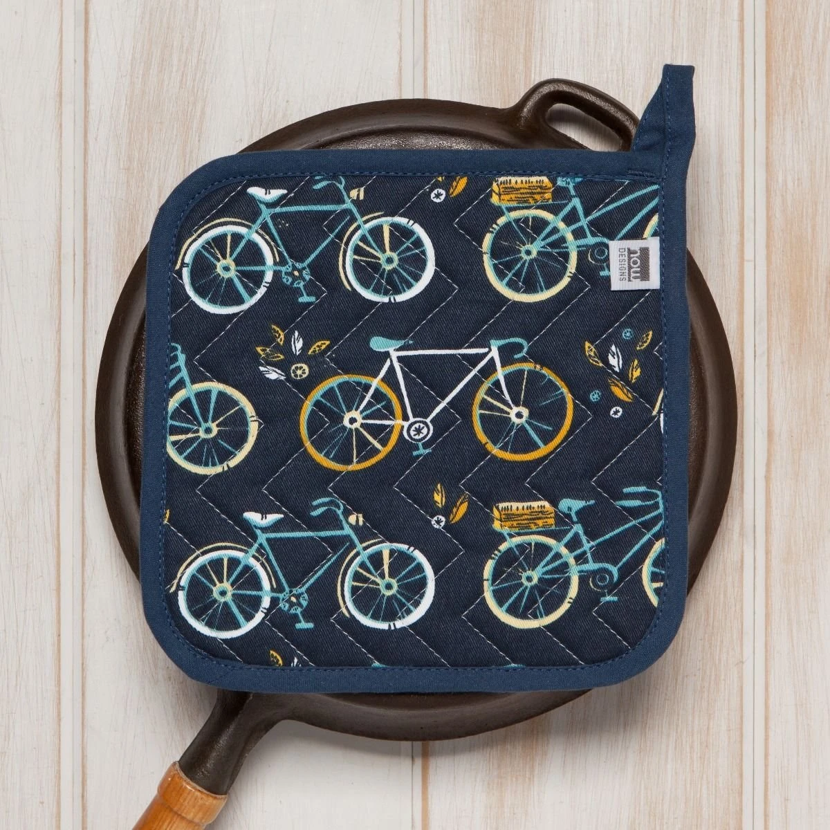 Bring a dash of character and charm into your home with the Danica Jubilee Sweet Ride Quilted Potholder! This adorable pot holder features yellow and blue vintage-style bicycles riding across a navy background. A loop at the corner allows for easy hanging storage. The 100% cotton quilted construction and polyester insulation work to protect your hands while you bake fresh fruit pies, savory casseroles, fluffy loaves of bread, and more! This potholder is machine-washable, making cleanup a breeze. Cooking in your kitchen will be a fun and easy ride with the Danica Jubilee Sweet Ride Quilted Potholder!