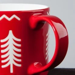 - The design features a red mug with reindeer silhouettes, Christmas trees, and night stars in white