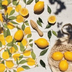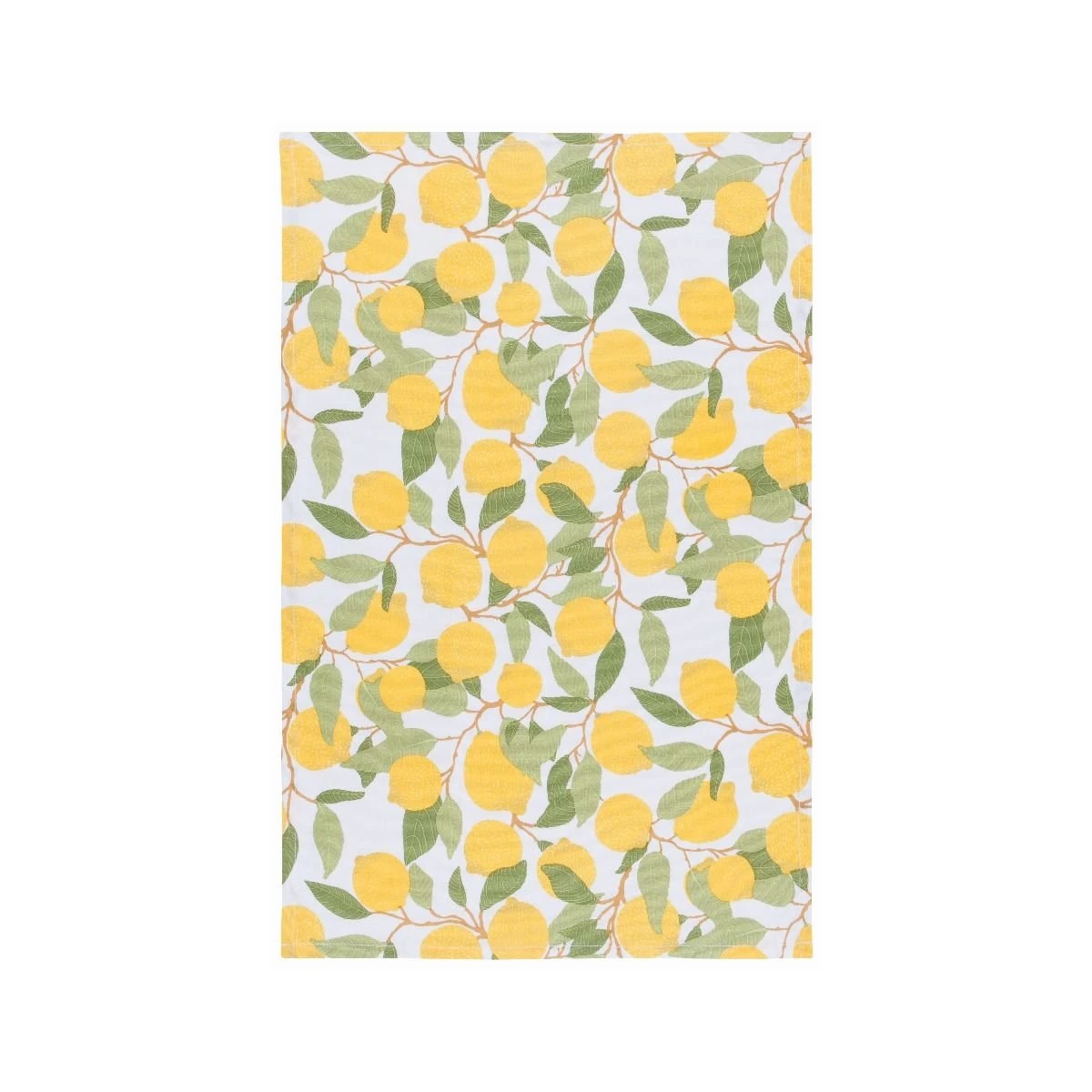 - Lemon dishtowel features branches of a lemon tree sprawling across a white background
