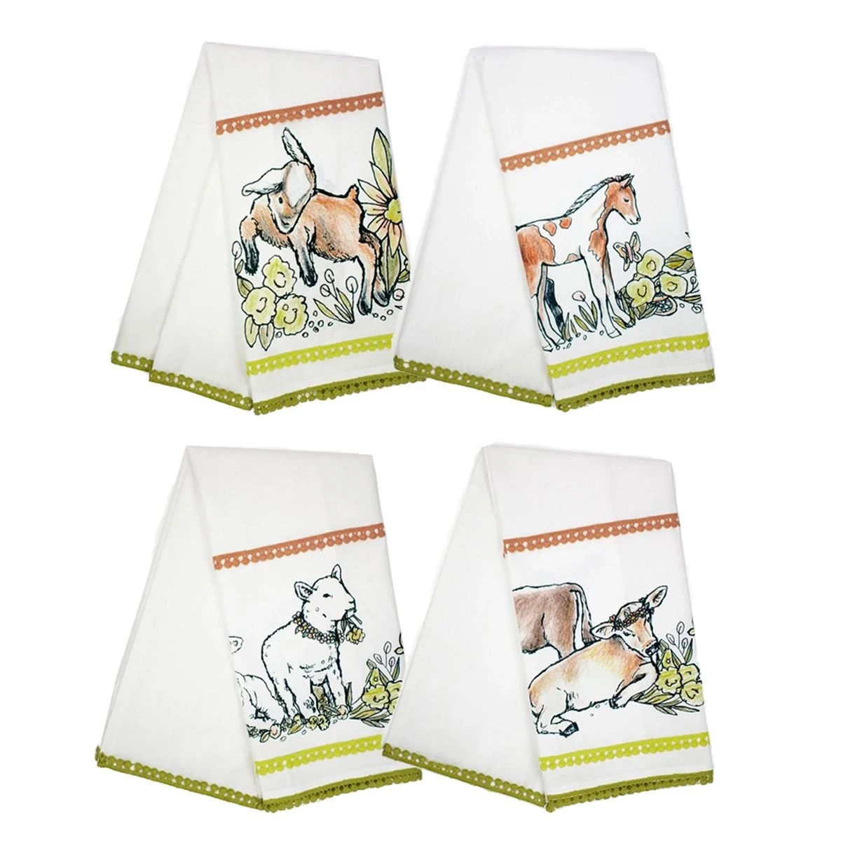 Bring the farmyard fun straight into your kitchen with the Everything Kitchens Exclusive Barnyard Babies Tea Towel Set! This set includes four tea towels – each featuring one of the precious baby animals from the set. With curious baby goats, darling jersey calves, lovely leaping lambs, and sweet horse foals amongst fields of blooming flowers, these beautiful tea towels are embellished with intricate trim detailing for a charming vintage look. Plus, each towel is made of 100% machine washable cotton and has a nifty cotton strap for hanging so you can display them in your kitchen or bathroom for a fun and playful accent!