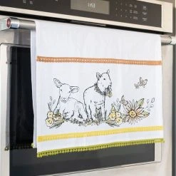 Bring the farmyard fun straight into your kitchen with the Everything Kitchens Exclusive “Leaping Lambs” Tea Towel + Pot Holder Set! This set includes a tea towel & pot holder featuring leaping baby lambs in a field of blooming flowers. Both have beautiful intricate trim detailing for a charming vintage look and are crafted with a strap for hanging so you can display them while not in use. Plus, they’re made of 100% cotton that’s machine washable for quick & easy cleaning. Display them with your existing kitchen décor for an adorable accent or with other pieces from the Barnyard Baby Animals Collection!