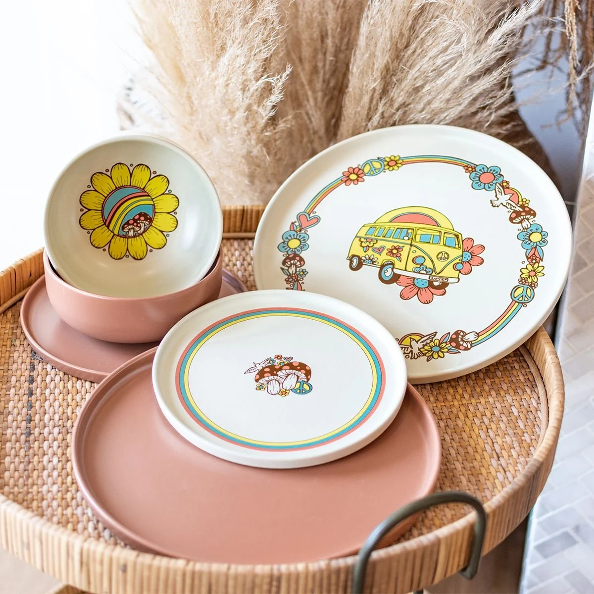 Hop on the old VW bus and travel back in time to the decade of change and all its groovy vibes, from bell bottoms and shag rugs to disco and the counter-culture! With the Everything Kitchens exclusive Peace & Love Collection, the iconic style of the 1970s is celebrated with mushrooms, peace signs, and flower power in bright, warm hues for a retro aesthetic so far out it’ll have you seeing stars! This set includes (4) dinner plates, (4) lunch plates, and (4) bowls in Modern Flat Beige with the Peace & Love Design, as well as (4) dinner plates, (4) lunch plates, and (4) bowls in Modern Flat Terracotta. Mix & match with other pieces from the Everything Kitchens Modern Flat Collection to create a colorful & unique table setting. If you find yourself feeling nostalgic for the days of disco and soul music, quit the jive-talking and order your Everything Kitchens Modern Flat Peace & Love dinnerware today!