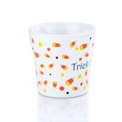 - Each white mug features a fun & festive candy corn design