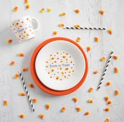 Skip the tricks & treat yourself or the Halloween fanatic in your life to the Fiesta® Candy Corn 15 oz. Tapered Mugs Set! Made of fully vitrified lead-free china that’s chip-resistant for a durable piece that’ll last years of use, this set includes four white mugs featuring a festive candy corn and polka dot design that’ll add an extra-sweet touch while enjoying hot apple cider, tea, & pumpkin spice lattes all October long! Plus, each mug is microwave and dishwasher-safe for easy cleaning. Pair with Poppy or Daffodil for a festive pop of color or use them as a Halloween accent with your existing dinnerware. Bring a touch of magic to your table this Halloween season with the Fiesta® Candy Corn 15 oz. Tapered Mugs Set!