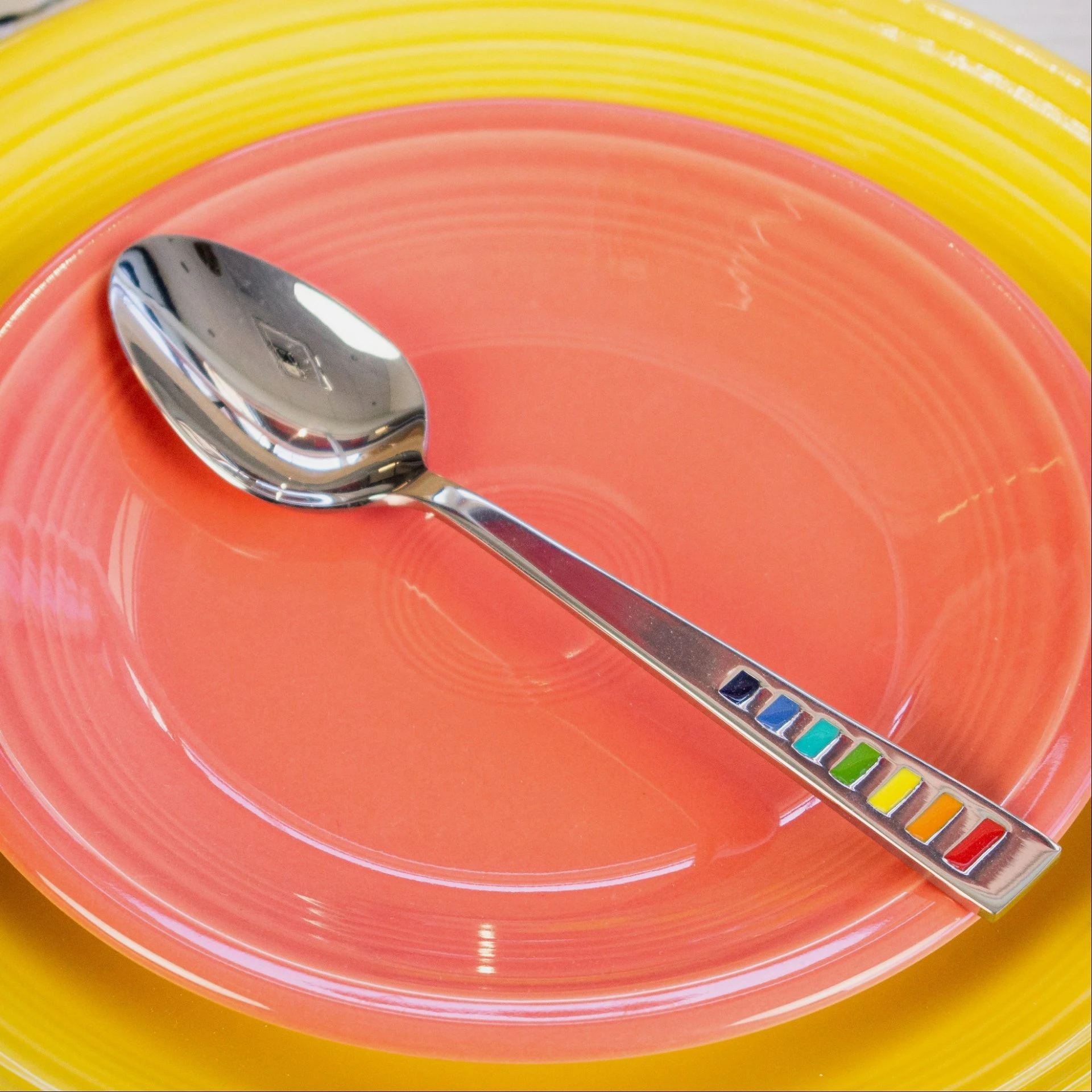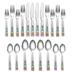 Make every meal a celebration with the Fiesta® Celebration 20-Piece Flatware Set. This stainless steel flatware set includes 4 teaspoons, soup spoons, dinner forks, salad forks, and dinner knives. Each piece has a handle with a gradation of colored squares, going from cobalt blue, to lapis blue, to turquoise, to shamrock, to daffodil, to tangerine, to scarlet. This series of colors were chosen to complement the Fiesta® Celebration pieces.