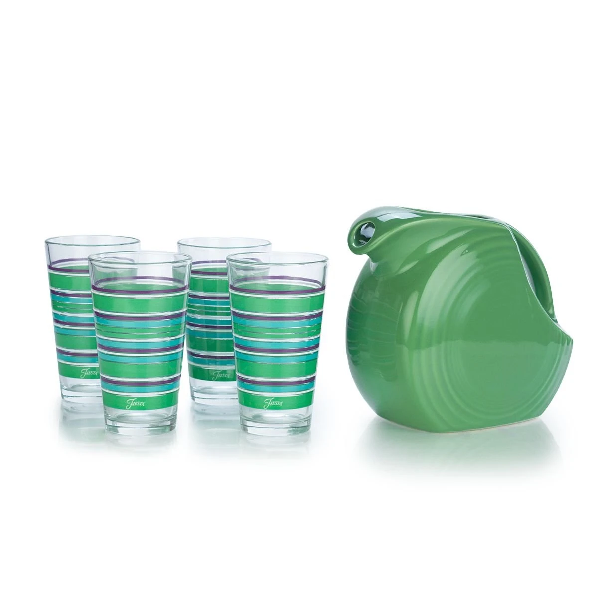 From weekly family meals to summer dinner parties, the Fiesta® Beverage Set for 4 in Farmhouse Chic will bring a bold pop of color to your table! This set includes a 2-Liter Disk Pitcher in Meadow & four 16oz Cooler Glasses that feature colorful stripes in Turquoise, Meadow, Mulberry, & White. This set will look great with any of your cool Fiesta® dinnerware pieces or as a colorful accent with neutral dinnerware. Bring a stylish touch while enjoying your favorite beverages around the table with friends & family with the Fiesta® Beverage Set for 4!