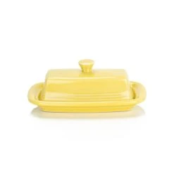 Keep your table butter fresh, spreadable, and free of contaminants with the XL Covered Butter Dish from Fiesta® Dinnerware . The Fiesta® Extra Large Covered Butter Dish in Sunflower is made from lead-free ceramic with a colored gloss glaze for a designer look and protection against chipping & breaking. This butter dish is microwave safe for softening refrigerated butter, and is dishwasher safe for easy cleanup. The cover includes a handle for easy lid removal and replacement. The Fiesta® Extra Large Butter Dish is backed by a 5-year warranty against chipping through the Homer Laughlin china co.