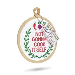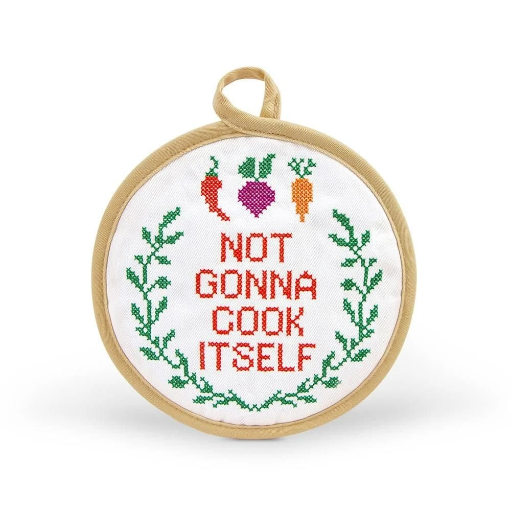 The Fred “Not Gonna Cook Itself” In Stitches Potholder is the perfect gift for your favorite cheeky chef or baker. Made from fabric and cotton, the front side features a unique stitch pattern with a green laurel and some vegetables with “Not Gonna Cook Itself” text. The backside also has a grippy silicone pattern with non-slip properties. It resists temperatures up to 450°F, and it is machine washable when it gets messy from all cooking and baking. You will be able to hang it away once you’re done using it with its convenient loop. Tell yourself to get it together endearingly and give your kitchen some spunky stitching with the Fred “Not Gonna Cook Itself” In Stitches Potholder!