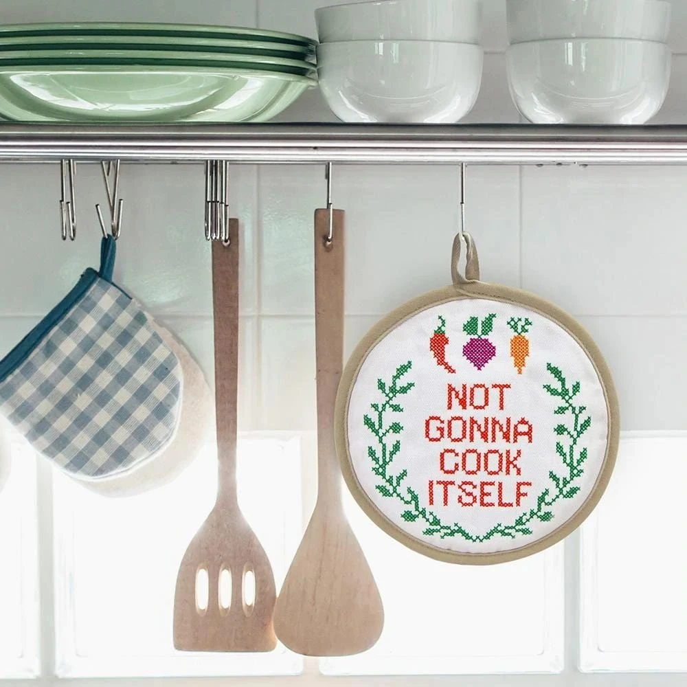 - The front side features a unique stitch pattern with a green laurel and some vegetables with “Not Gonna Cook Itself” text