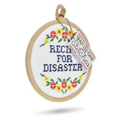 The Fred “Recipe For Disaster” In Stitches Potholder is the perfect gift for your favorite cheeky chef or baker. Made from fabric and cotton, the front side features a unique stitch pattern with garlands with pink and yellow flowers along with “Recipe for Disaster” text. The backside also has a grippy silicone pattern with non-slip properties. It resists temperatures up to 450°F, and it is machine washable when it gets messy from all cooking and baking. You will be able to hang it away once you’re done using it with its convenient loop. Tell your friends and family to clear out and give your kitchen some spunky stitching with the Fred “Recipe For Disaster” In Stitches Potholder!