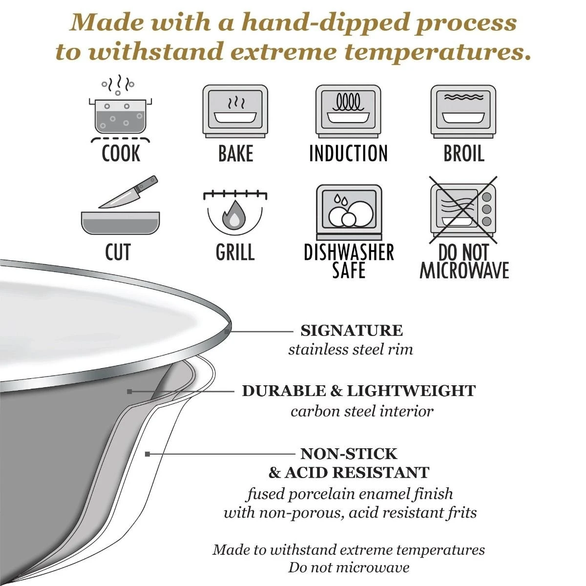 Golden Rabbit Enamelware is created using a traditional handmade production method that has changed very little since the late 18th century. Each piece is hand-dipped and fired at extremely high temperatures causing the steel to contract and fuse the porcelain enamel to the steel, creating a durable, non-porous surface. Slight color variations and imperfections are natural byproducts of this craft and are not due to any inattention to detail. These inherent aspects of the enameling process are part of the charm and uniqueness that make enamelware so popular.