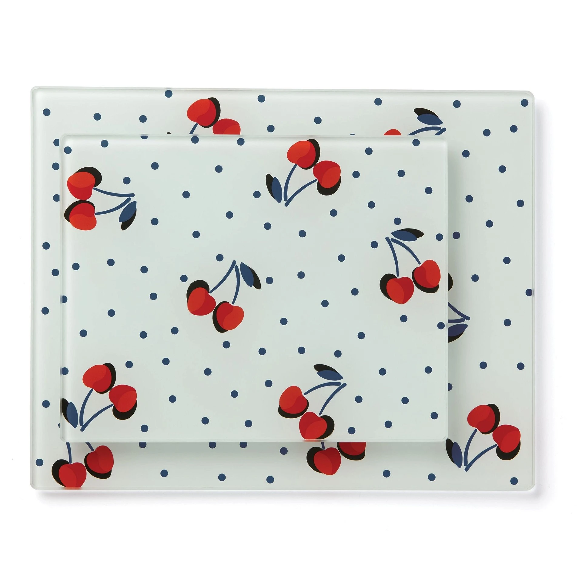Create a delicious charcuterie board with the Kate Spade Vintage Cherry Dot Collection 2-Piece Pep Board Set. These glass prep boards come in two convenient sizes, a 10” and a 13”. This allows you to match the board to serving size. Both prep boards feature a vintage polka-dot pattern with vibrant cherries. These charming designs add a splash of fun to any kitchen and makes them ideal for displaying anything from gourmet baked goods to simple meat and cheese spreads. When you’re done using the Vintage Cherry Dot Prep Board Set, the glass construction makes it easy to clean by hand. Display your culinary creations with pride, get the Kate Spade Vintage Cherry Dot 2-Piece Board Set today!