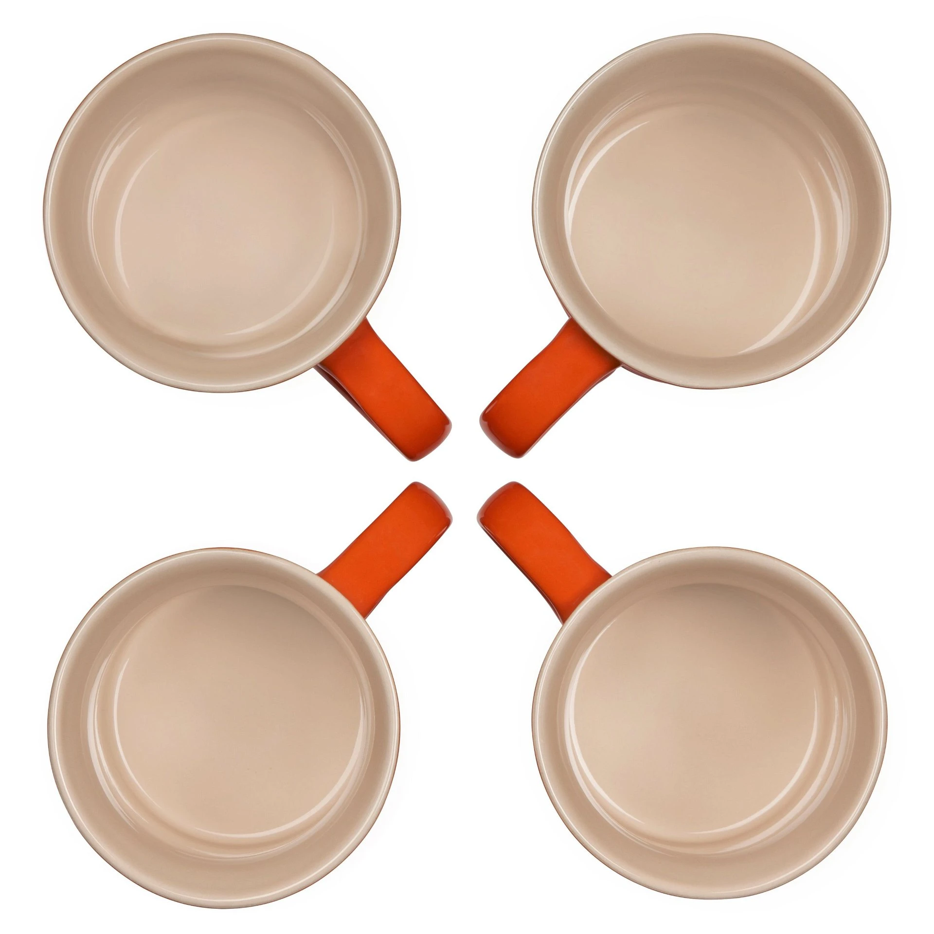 Pour yourself a morning brew, an afternoon spot of tea, or an evening cup of hot chocolate in this lovely set of 4 Le Creuset 14oz Stoneware Mugs in Flame Orange for that blissful moment you can call your own. The dense stoneware blocks moisture absorption to prevent cracking, crazing, and rippling and can withstand the broiler, microwave, and oven for a variety of uses. The nearly-nonstick glazed interior easily releases foods for quick cleanup for the days when soup or other comfort foods are a must.