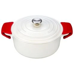 Protect your hands when moving cookware on the stove or carrying a finished meal to the table with these Silicone Handle Grips in Cerise/Cherry Red by Le Creuset. Designed to shield hands from heat while providing a secure grip, these pot handle grips will fit a variety of Le Creuset cookware and bakeware handles, and accommodate many other brands as well. Each 5” x 2.5” silicone handle grip is textured and flexible for optimal gripping of even heavy, fully-loaded dutch ovens. Like pot holders for your fingers, they’re flexible to accommodate many size handles. Use these handle grips to pull a Heritage or Signature baking dish from the oven, to bring a stock pot of boiling pasta to the sink to drain, to move a Dutch oven to and from the oven, or leave them hanging on the handles of hot pots and dishes on the stove or at the table to protect against accidental burns.
