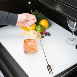 The next time it’s your turn to entertain, show off your masterful mixology skills by reaching for professional-quality bar tools from Barfly Mixology Gear by Mercer. With the Barfly 19.6” Copper-Plated Stainless Steel Bar Spoon with Fork M37017CP, you’ll show a deft hand at properly mixing pitchers of sangrias, mojitos, mint juleps, or spiked lemonades and punches for your cocktail-loving friends. Barfly’s fetching Copper-plated bar spoon is formed from a single piece of durable stainless steel that won’t absorb stains or odors that could cloud the taste of fine spirits. This dual-use bar tool has a spoon on one end and a fork on the other. The spoon is precision-molded for accurate measuring, precise pouring, and gentle stirring; the fork end is designed with long tines, two of which are barbed, to securely spear fragile garnishes like fresh and candied fruit, olives, and onions. The elegant spiraled handle is designed with a twist to gently mix ingredients without bruising, and at a statuesque 19.6” long, it’s perfect for tall drink glasses and pitchers. With such alluring looks and expert performance, Barfly Mixology Gear by Mercer can turn your kitchen into the neighborhood’s trendiest cocktail lounge.