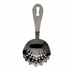 Made of 18-8 stainless steel, this durable black julep strainer features strong, welded construction. The perforated pattern allows fast draining so you don’t keep your guests waiting for long. The bend in the handle rests on the glass for a sure grip to prevent messes while looking professional. Keep this Barfly Stainless Steel Scalloped Julep Cocktail Strainer in your arsenal so you will be prepared for any cocktail your guests request!