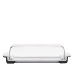 If you need one tablespoon of butter, just follow the measurement markings on the OXO Good Grips Wide Butter Dish. The dish and the butter stays in place while cutting due to butter boundaries on three sides and rubberized non-slip feet on either end of the dish. This extra wide butter dish can be comfortably carried back and forth from the table to the countertop, to the refrigerator. The clear lid on the white dish gives you a clean view for refills. With soft, comfortable, non-slip handles, this butter dish is easy to pass around after you butter up your corn. There is a small OXO logo in the center of the top of the lid. If you like bagels, buy two, one for butter and one for cream cheese.