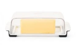 If you need one tablespoon of butter, just follow the measurement markings on the OXO Good Grips Wide Butter Dish. The dish and the butter stays in place while cutting due to butter boundaries on three sides and rubberized non-slip feet on either end of the dish. This extra wide butter dish can be comfortably carried back and forth from the table to the countertop, to the refrigerator. The clear lid on the white dish gives you a clean view for refills. With soft, comfortable, non-slip handles, this butter dish is easy to pass around after you butter up your corn. There is a small OXO logo in the center of the top of the lid. If you like bagels, buy two, one for butter and one for cream cheese.