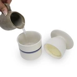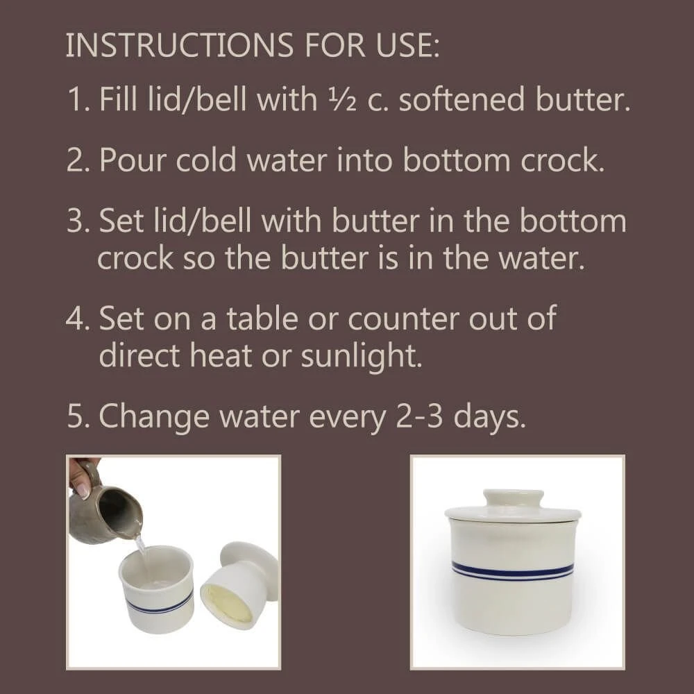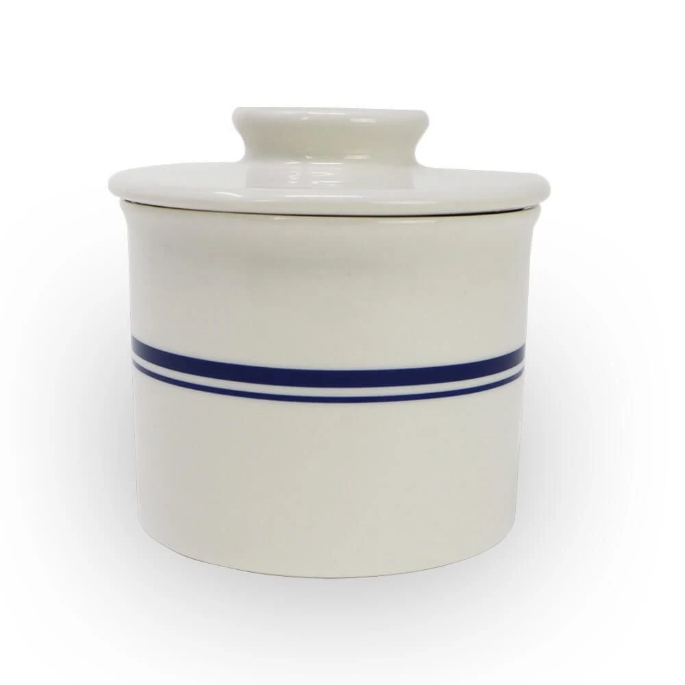 Never worry about scraping cold butter on your breakfast pastries or bread again with the Roots & Harvest Butter Keeper Crock! This stoneware butter crock allows you to keep room temperature butter fresh and on hand for toast, muffins, freshly baked bread, and more. Simply add cold water to the base, fill the top with your butter of choice, then place it upside down in the crock to ensure your butter stays fresh for up to a month. By creating an airtight seal around the butter, the water allows the crock to lock in flavors and maintain a smooth consistency. Finished in a crisp linen white with simple yet elegant blue lines, this butter crock is a convenient and attractive addition to your table or countertop. Enjoy perfectly spreadable, soft butter anytime with the Roots & Harvest Butter Keeper Crock!
