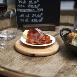 Avoid burning your tabletops and use your Staub Cocotte/Dutch Oven safer with the Staub Round Magnetic Wooden Trivet 9″ – Large. This nine inch wooden trivet has magnets embedded inside so your cast iron cookware sits perfectly on the trivet for serving a delicious meal to your family.