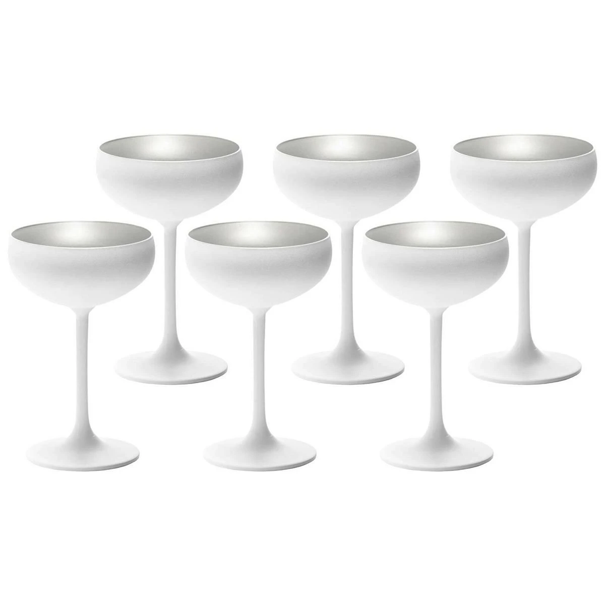 Stolzle 7.75oz Olympia Crystal Champagne Saucer Coupe Glasses – Set of 6 (White & Silver) Features: