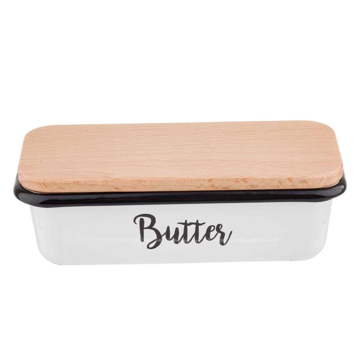 Keep room temperature butter at the ready while adding a modern farmhouse charm to your kitchen with the TableCraft Butter Dish with Lid! Made from enamel-coated steel with a snug-fitting wooden lid, this dish holds one standard stick of butter. The white enameled finish with a handwritten “Butter” label in cursive will resist chipping and fading over time, adding a chic touch to your counter or tabletop for years to come. Spread perfectly smooth butter for pancakes, toast, dinner rolls, and more with the TableCraft Butter Dish with Lid!