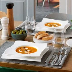 Make stylish waves in your dining room by serving guests with the Villeroy & Boch NewWave 30-Piece Dinnerware Set! This dinnerware set is made from Villeroy & Boch’s premium porcelain, which resists chipping, cracking, and crazing. The waved square shape of the plates and bowl make for a unique elevation to classic dinnerware, while the waved handles of the mugs make for sophisticated sipping. While durable enough for everyday use, each piece of the NewWave Collection stands on its own as a modern art piece – allowing for a sleek meal presentation every day of the week.